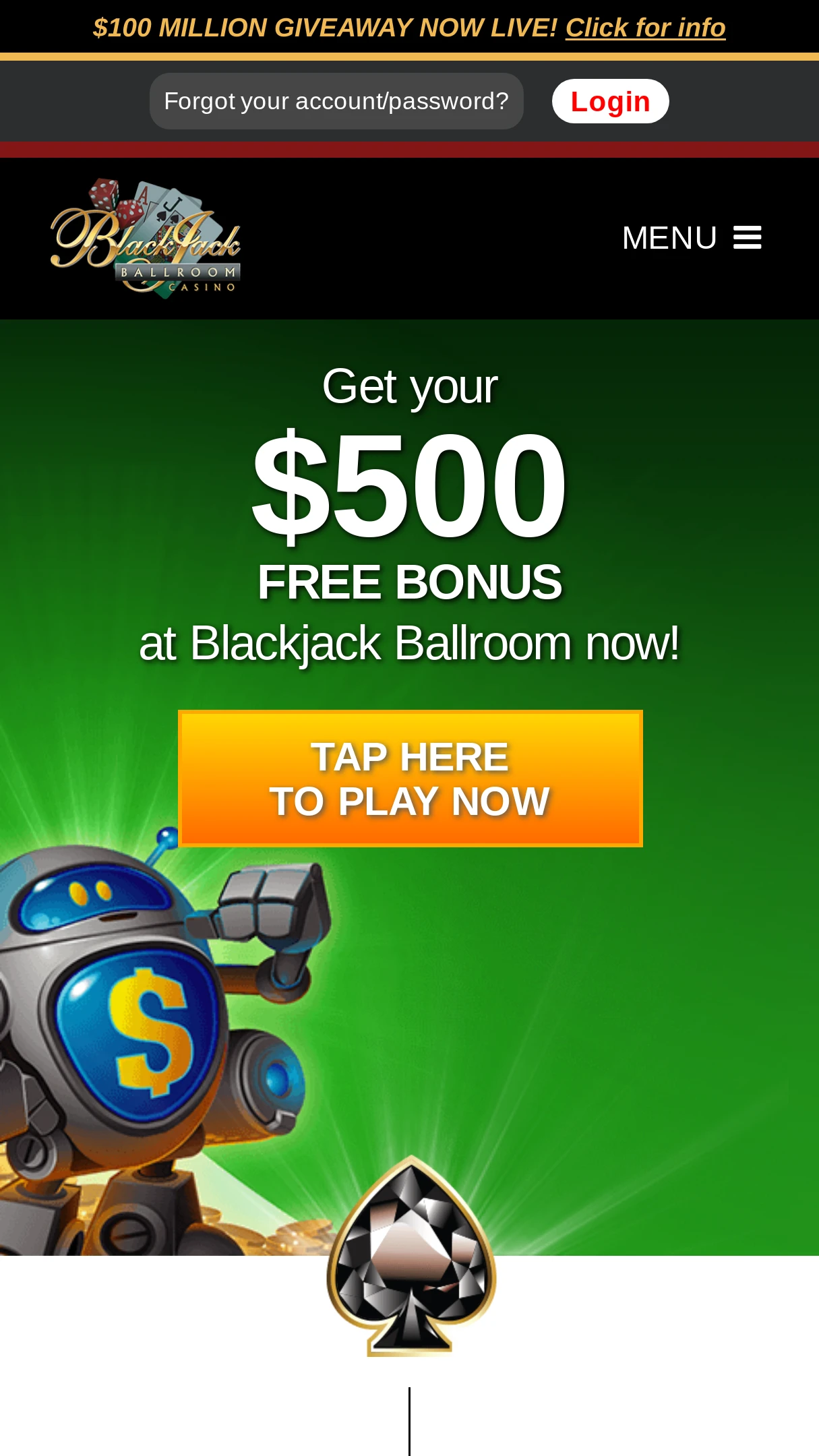 New players at Blackjack Ballroom receive a free hour of playing time with $500 from the casino, which is a generous offer. You must make 20 bets in this time and win $20 over the $500, but once you have made a minimum $20 deposit into your account you will be able to claim your winnings from this hour, which is a good bonus for new customers.