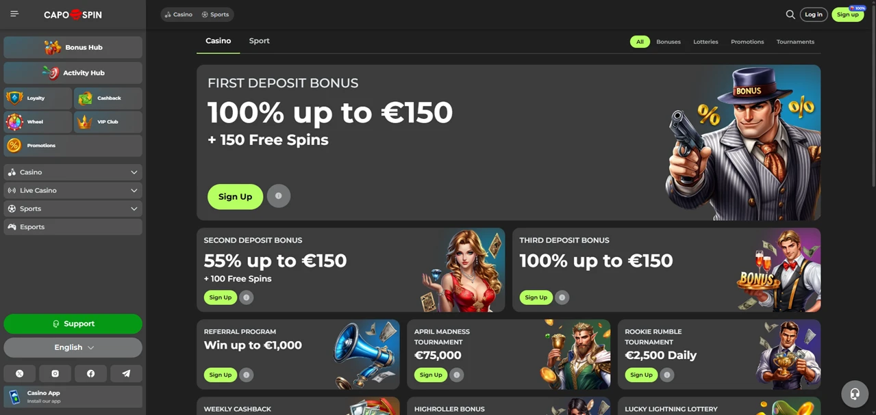Capospin Casino employs a mobile-first approach with its web application in preference to natively installed apps. Its web application allows players to enjoy a full suite of games with no compatibility issues or space limitations. Even without an installable application in traditional app stores, the web version is convenient, sleek, and smooth for beginners and advanced players.