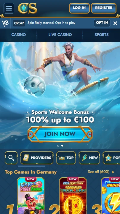 Atlantis brought to life on a casino homepage — titans, deep-sea ruins, and a goddess commanding the waves from the welcome banner. Casea doesn’t look like a reskin. The mythical undersea theme runs through every layer of the platform, from the game lobby to the Collections system. No native app. Everything runs in the browser.