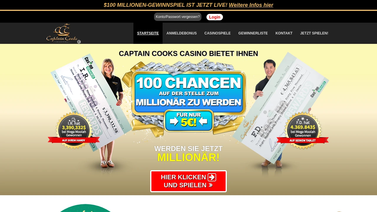 Die mobile Website des Captain Cook Casinos bietet seinen neu registrierten Spielern einen Anmeldebonus und verschiedene Match-Boni bei späteren Einzahlungen. Außerdem kannst du als Neukunde Freispiele erhalten. Captain Cook Casino ist ein Online-Casino, das du auf dein Handy herunterladen und sofort nach der Anmeldung spielen kannst. Nur Spieler/innen aus den USA dürfen sich aufgrund staatlicher Vorschriften nicht auf der Website registrieren. Das Captain Cook Casino wurde 1999 gegründet und gehört zu Belux Enterprises Ltd Casinos. Dieses mobile Casino ist ebenfalls Teil der großen Casino Rewards Group und gilt als eines der besten Microgaming Casinos.Das Captain Cook Casino verwendet Microgaming Software und ist von der Ontario Gaming Commission, der Kahnawake Gaming Commission und der UK Gambling Commission lizenziert. Seine Spiele werden ständig überwacht, um Probleme und das Spielen von Minderjährigen zu erkennen. In einigen Fällen überwacht das Captain Cook Casino auch bestimmte Spieler und setzt ein Wettlimit, wenn es für notwendig erachtet wird.